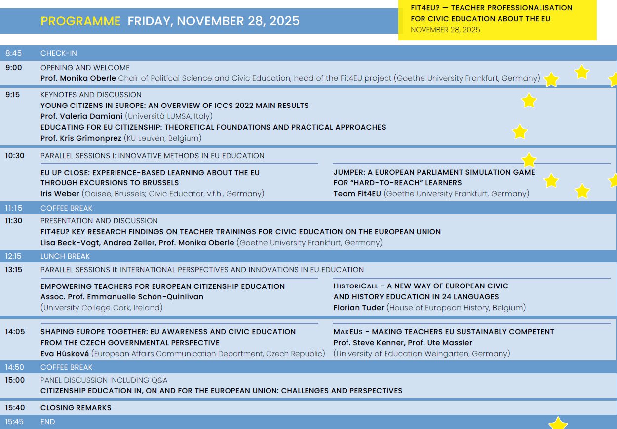 Anfang Februar 2025 ging das Jean-Monnet-Projekt Fit4EU in seinen zweiten Durchgang. Den Auftakt des zweiten Zyklus‘ bildeten zwei Fortbildungen am 12. und 13. Februar 2025 für Lehrkräfte an weiterführenden und beruflichen Schulen.